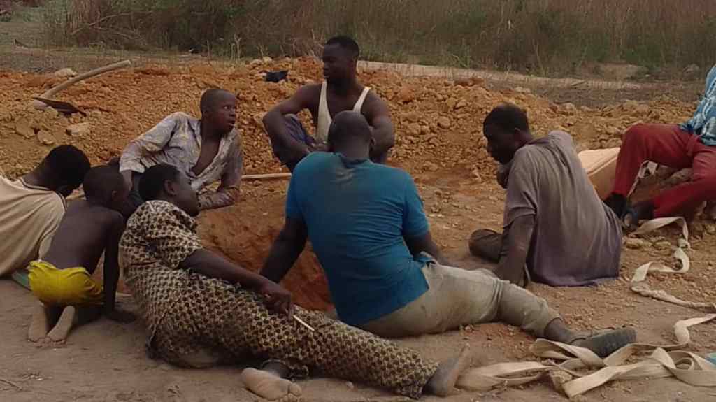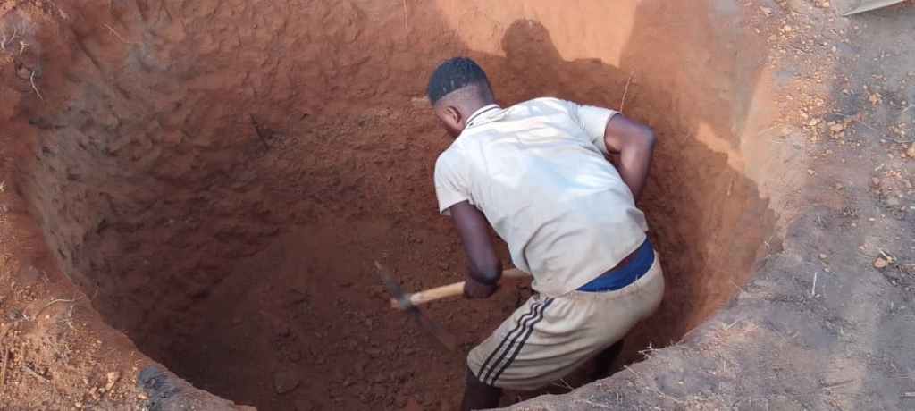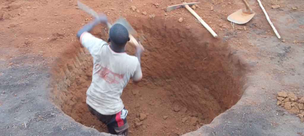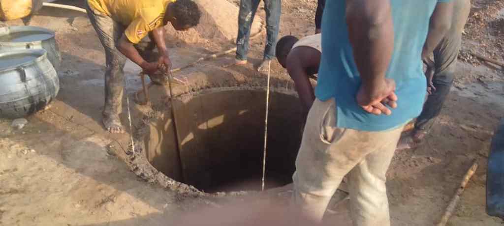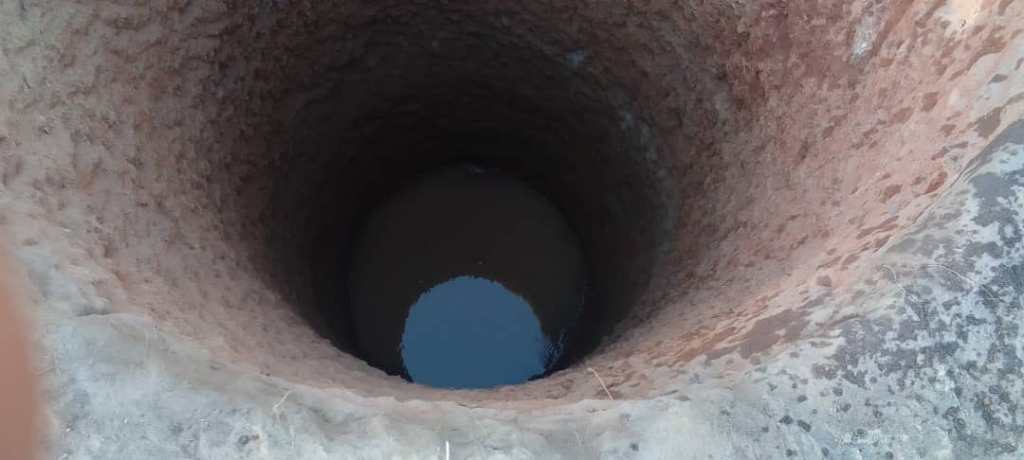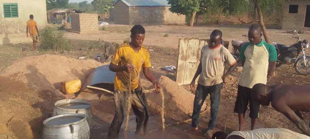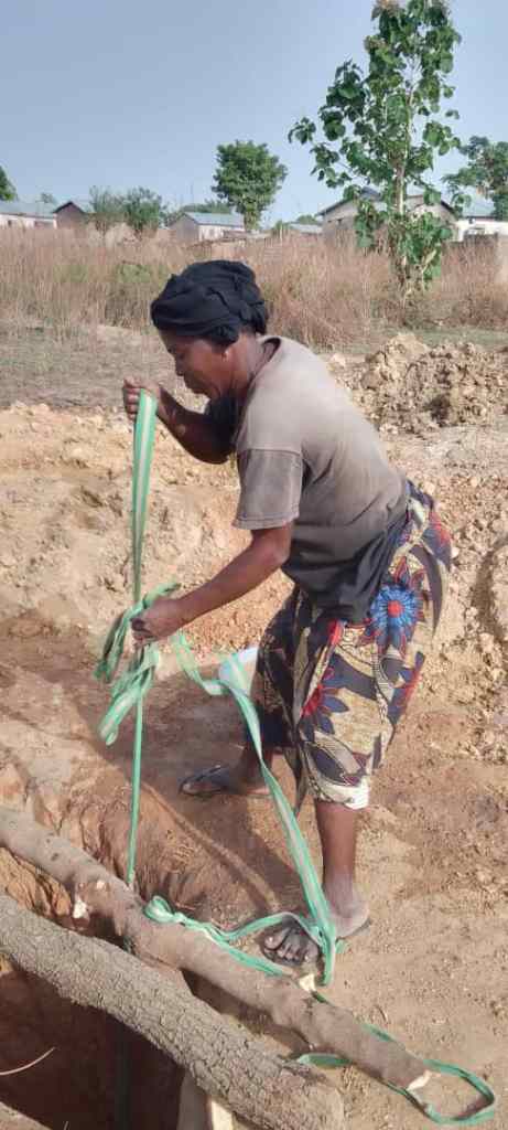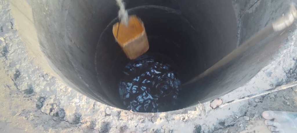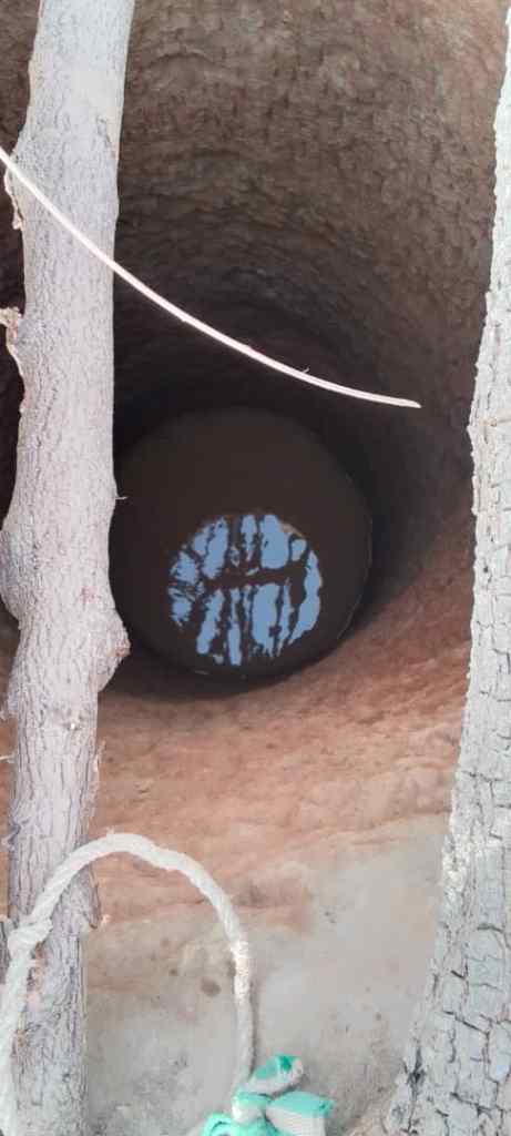 Ce forage avance bien mais fournit en ce début d’avril 2026 un niveau impropre à la consommation. A quelques femmes du village de dégager l’eau stagnante pour assécher le fond et rendre possible la suite du forage.